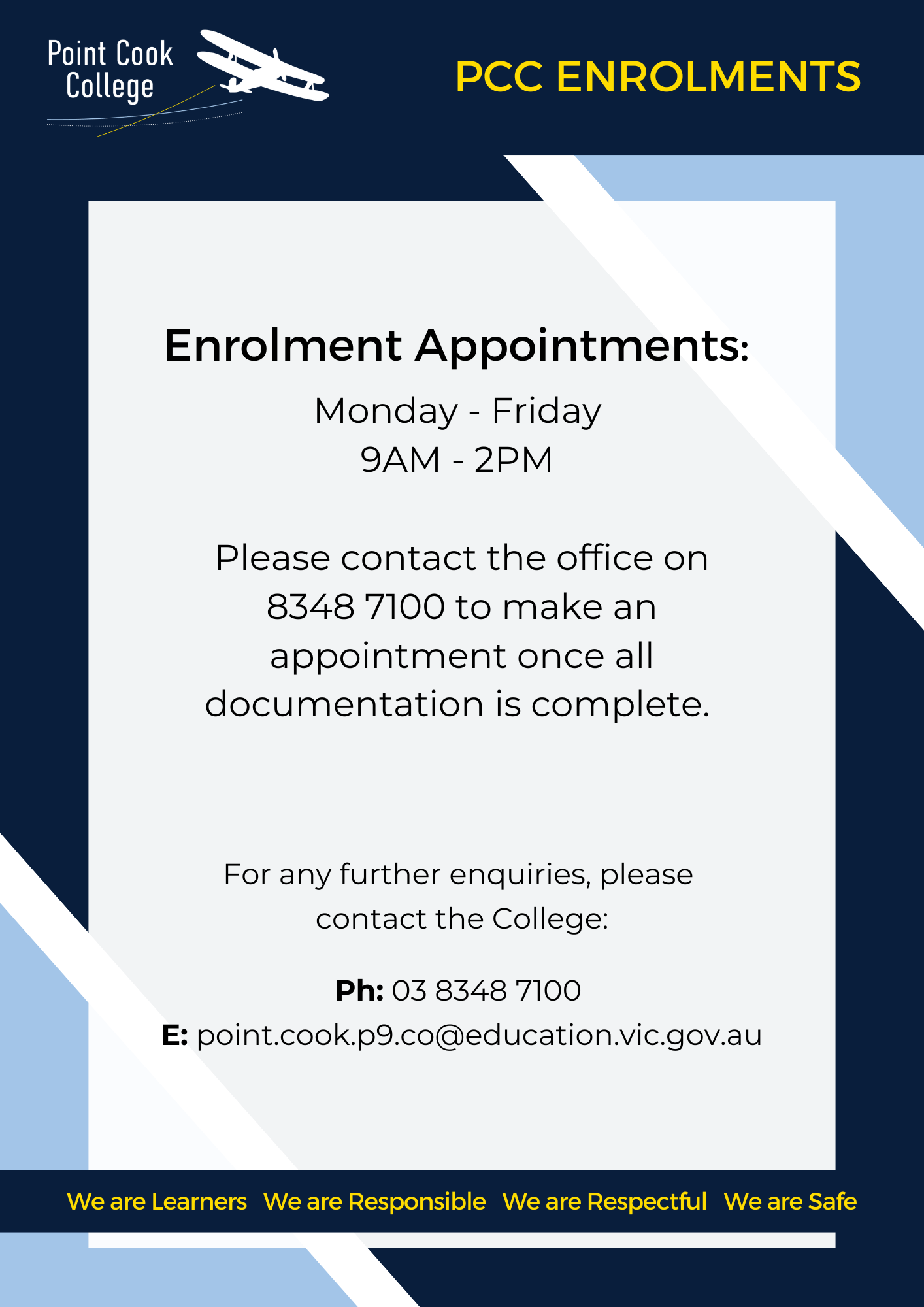 Point Cook P – 9 College offers enrolment places to children who live within our designated areas. We are required to manage our enrolments according to the Priority Placement Order in the Department of Education and Training’s enrolment policy.